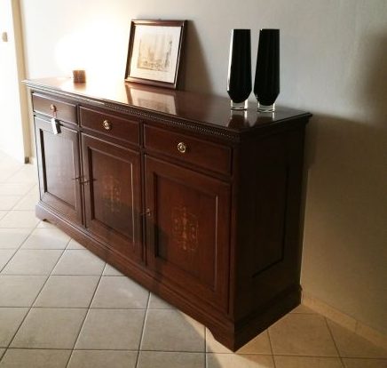 Fa parte della linea I Ciliegi di Le Fablier e la sua particolarità è l’intarsio sotto il cappello a coda di rondine e l’intarsio floreale nel prontale dell’ante.