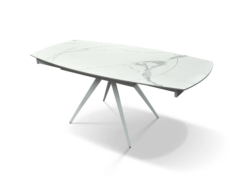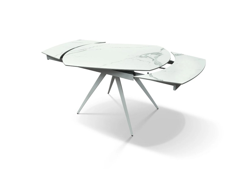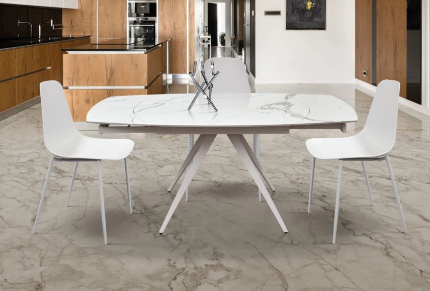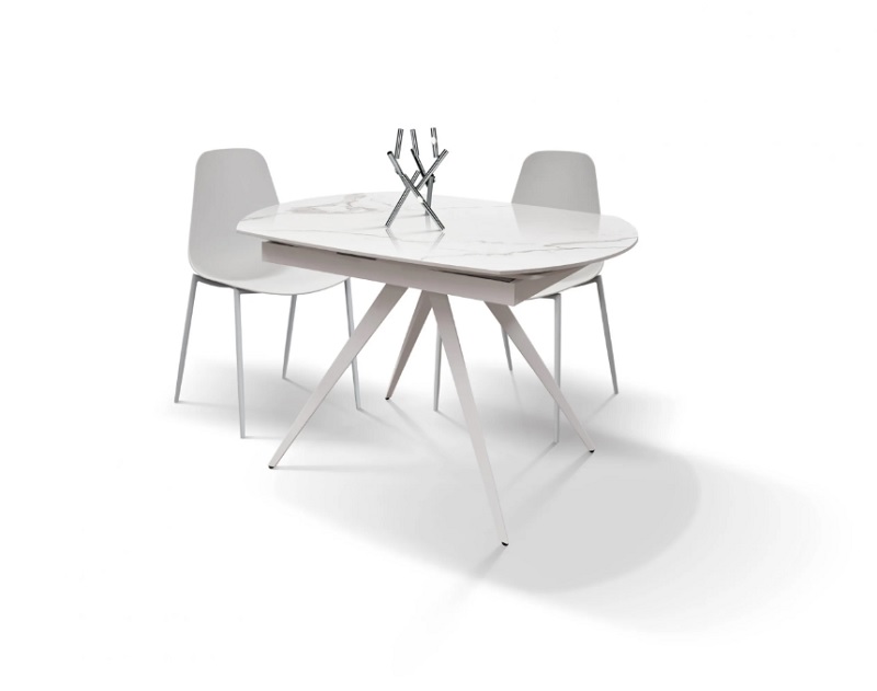 Tavolo allungabile con struttura in metallo verniciato e piano girevole in gres porcellanato effetto marmo spessore 12mm.