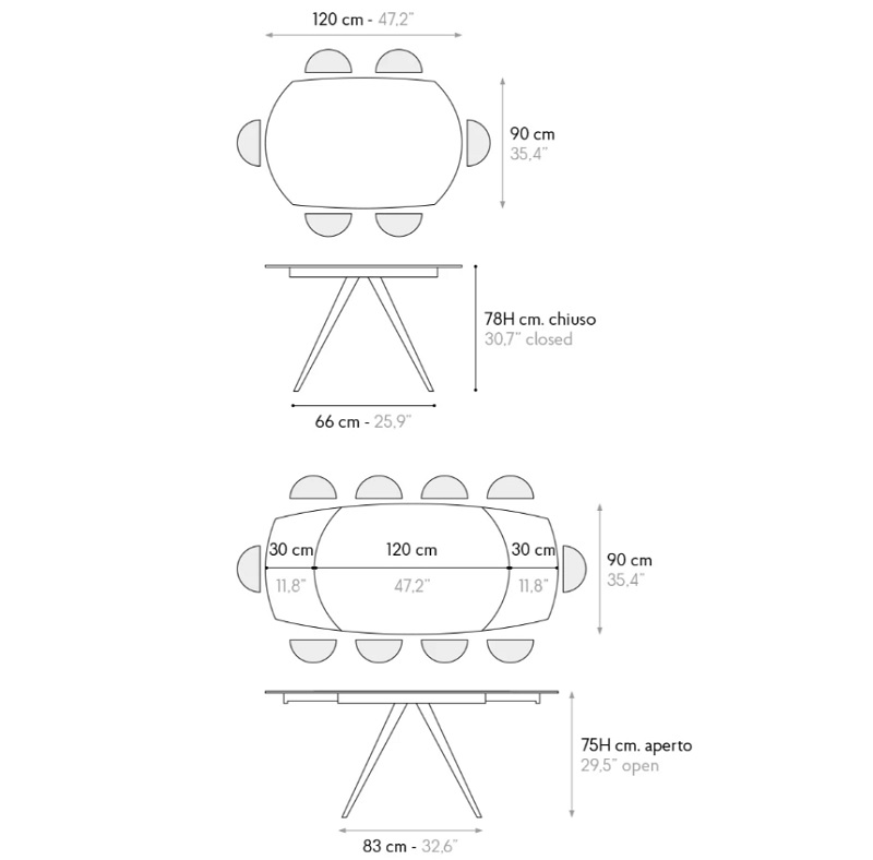 Dimensioni: L 120/180 P 90 H 75/77 cm